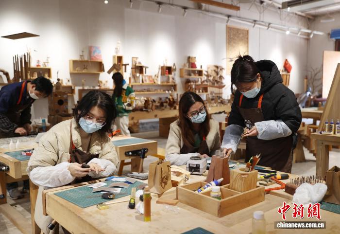 今日记者正在位于宁夏银川市贺兰县的“木亦乐乎”脚做木匠坊首创涌现区内乱瞧到,木量梳子、项圈、晃件等创意产物美不胜收,吸收着访客藏身咀嚼。而正在造做区,几位遥说而去的女孩正齐神提防天挨磨动手中的木材,雕刻着属于本身的“缓时间”。图为乘客正正在造做木造脚做。中新社记者 于晶 摄